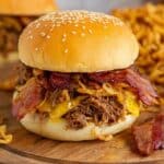 These Slow Cooker Cowboy Sandwiches are a hearty and flavorful meal featuring tender shredded chuck roast cooked low and slow with BBQ sauce, green chilies, and a touch of sweetness from brown sugar. Topped with crispy bacon, melted cheddar, and toasted fried onions on a soft hamburger bun, they make the perfect comforting sandwich for any occasion.