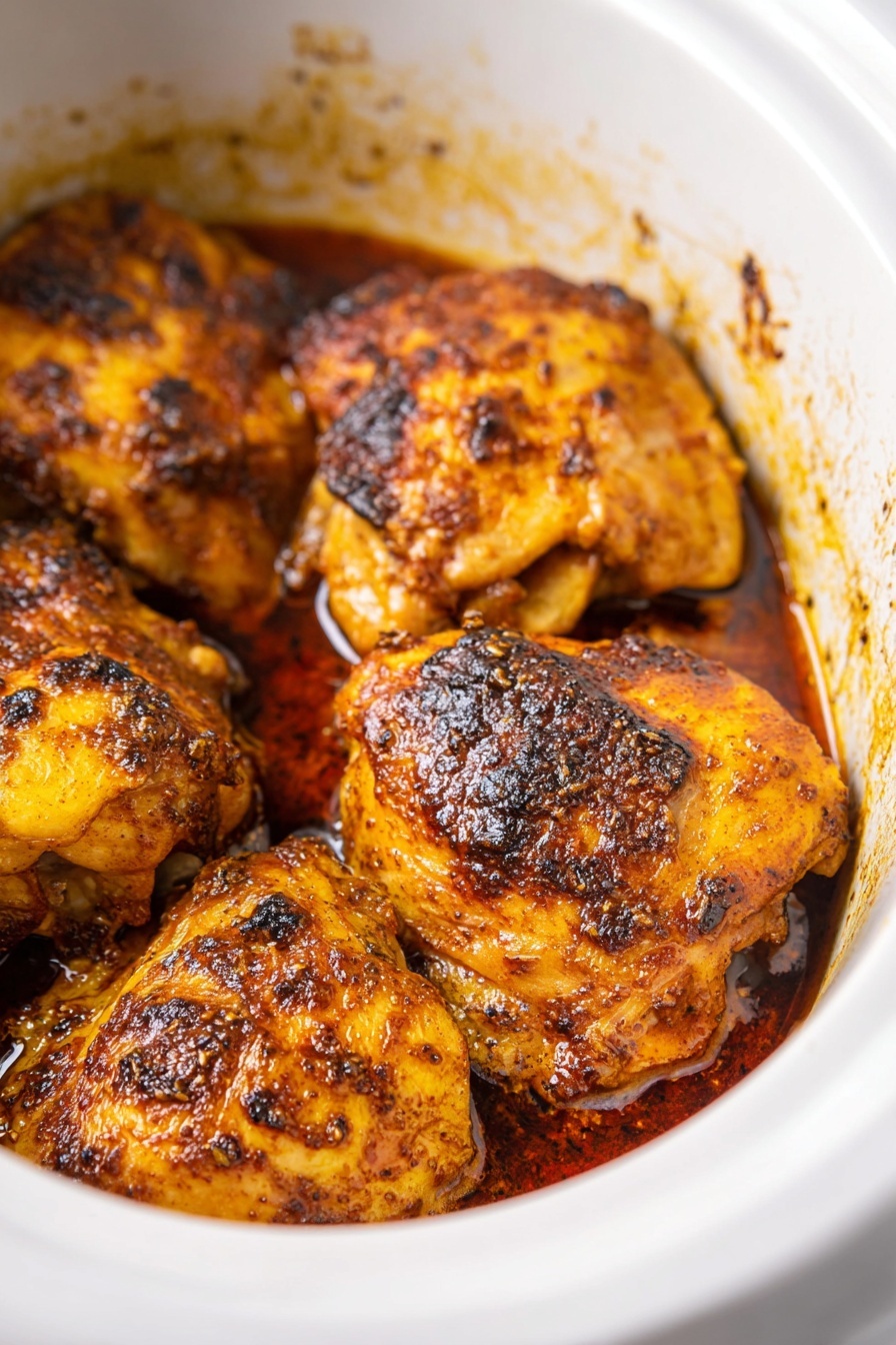Place the seared chicken thighs skin side up in the slow cooker—this helps the skin stay crispy by keeping it away from the liquid. Cook on low for 5 hours, or until the internal temperature hits 185°F (85°C). This low-and-slow cooking method guarantees tender, juicy chicken that’s infused with all the spices we blended earlier.