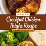 This Crockpot Chicken Thighs recipe features tender, flavorful bone-in, skin-on chicken thighs slow-cooked to perfection. The chicken is first seasoned with a smoky and savory spice rub, seared to develop a crispy crust, then slow-cooked with garlic and chicken broth for juicy, melt-in-your-mouth results. This easy, hands-off recipe makes for a comforting and delicious meal perfect for any day of the week.