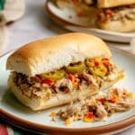 - Assemble the Sandwiches: Place a slice of provolone cheese on the bottom half of each toasted bun. Spoon the hot shredded chicken mixture over the cheese so it melts slightly. Top the sandwiches with extra pepperoncini slices and giardiniera. Close and serve immediately for best enjoyment.