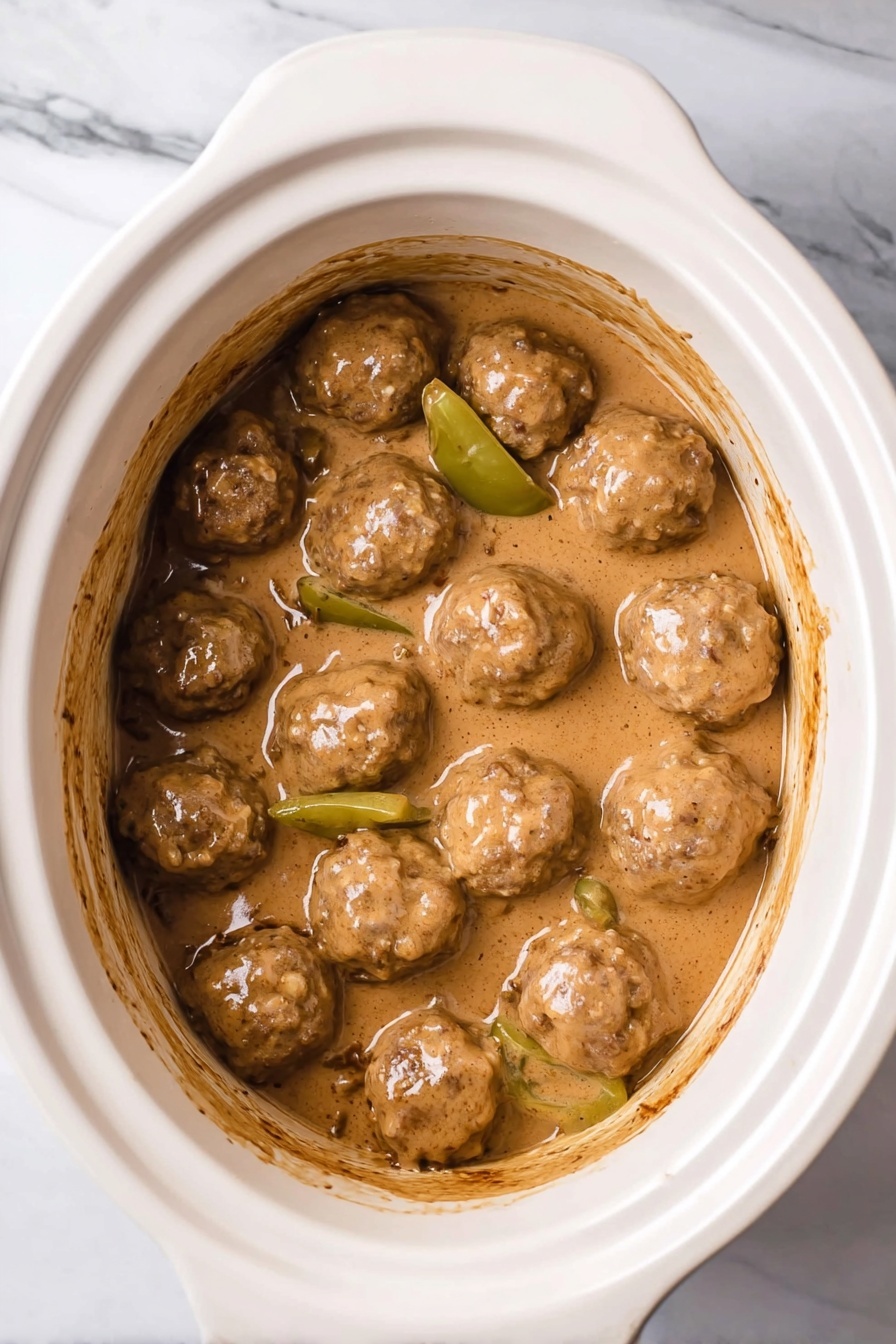 Pour your sauce mixture over the meatballs, letting it seep into every nook and cranny. Then, tuck whole pepperoncini peppers throughout the slow cooker — these will gently infuse the dish with a little heat and a delightful tang as they cook. Don’t worry, they’re mild enough that even kids tend to love the flavor they add.