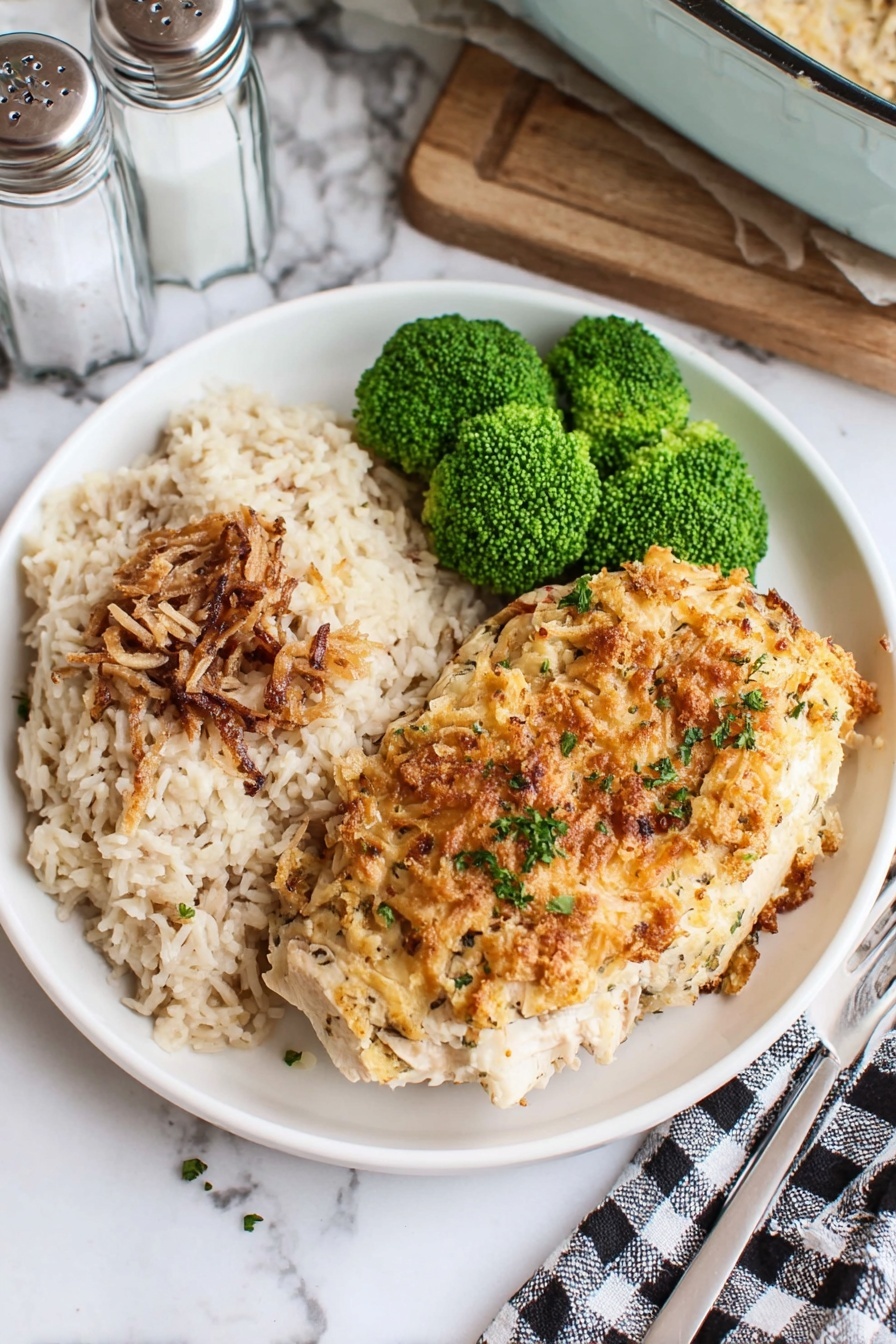 - Cream of chicken soup: Adds body and rich chicken flavor that melds perfectly with the rice and chicken.
