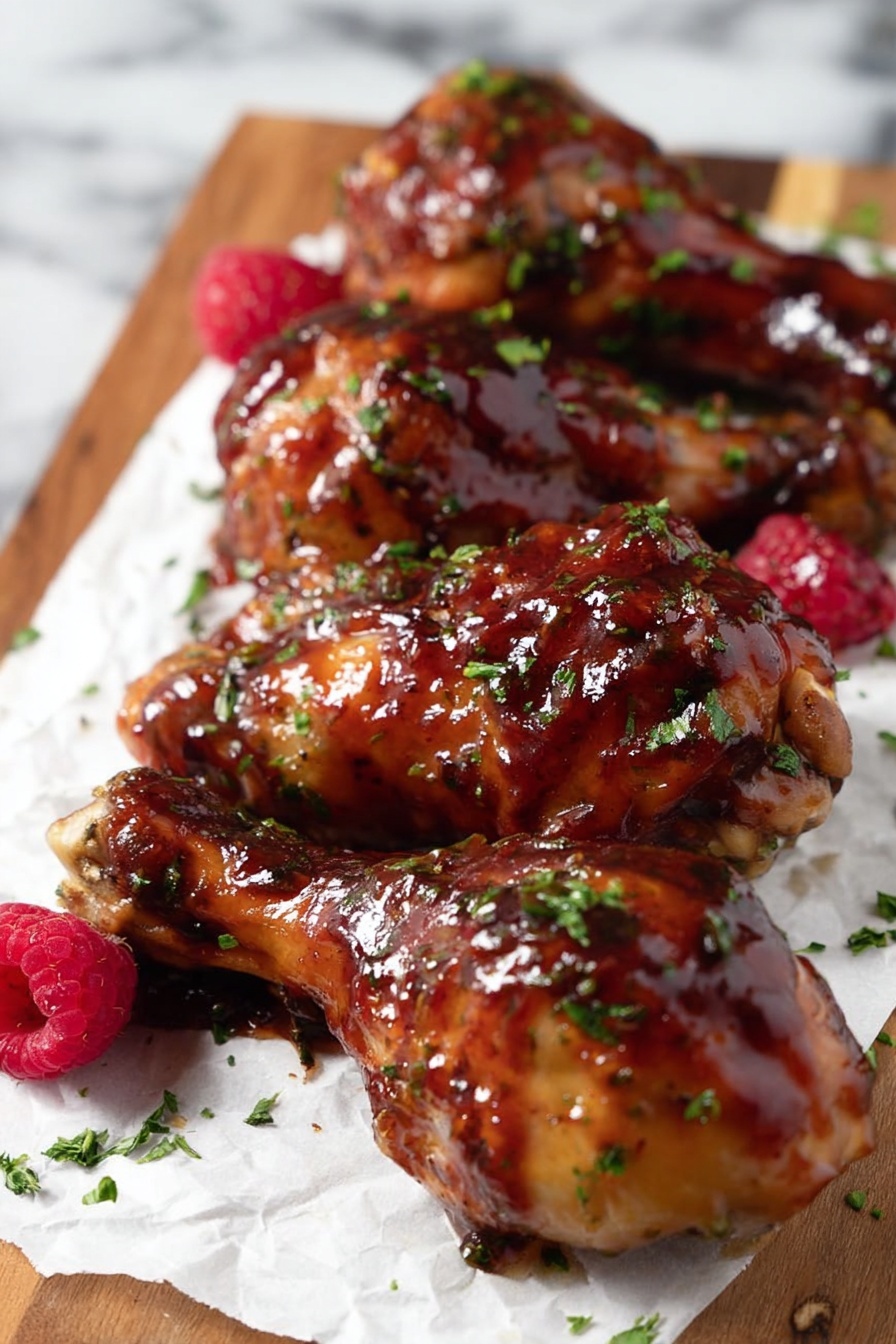 10. Serve: Serve the drumsticks immediately out of the oven, with any leftover raspberry glaze on the side for dipping or additional drizzling.
