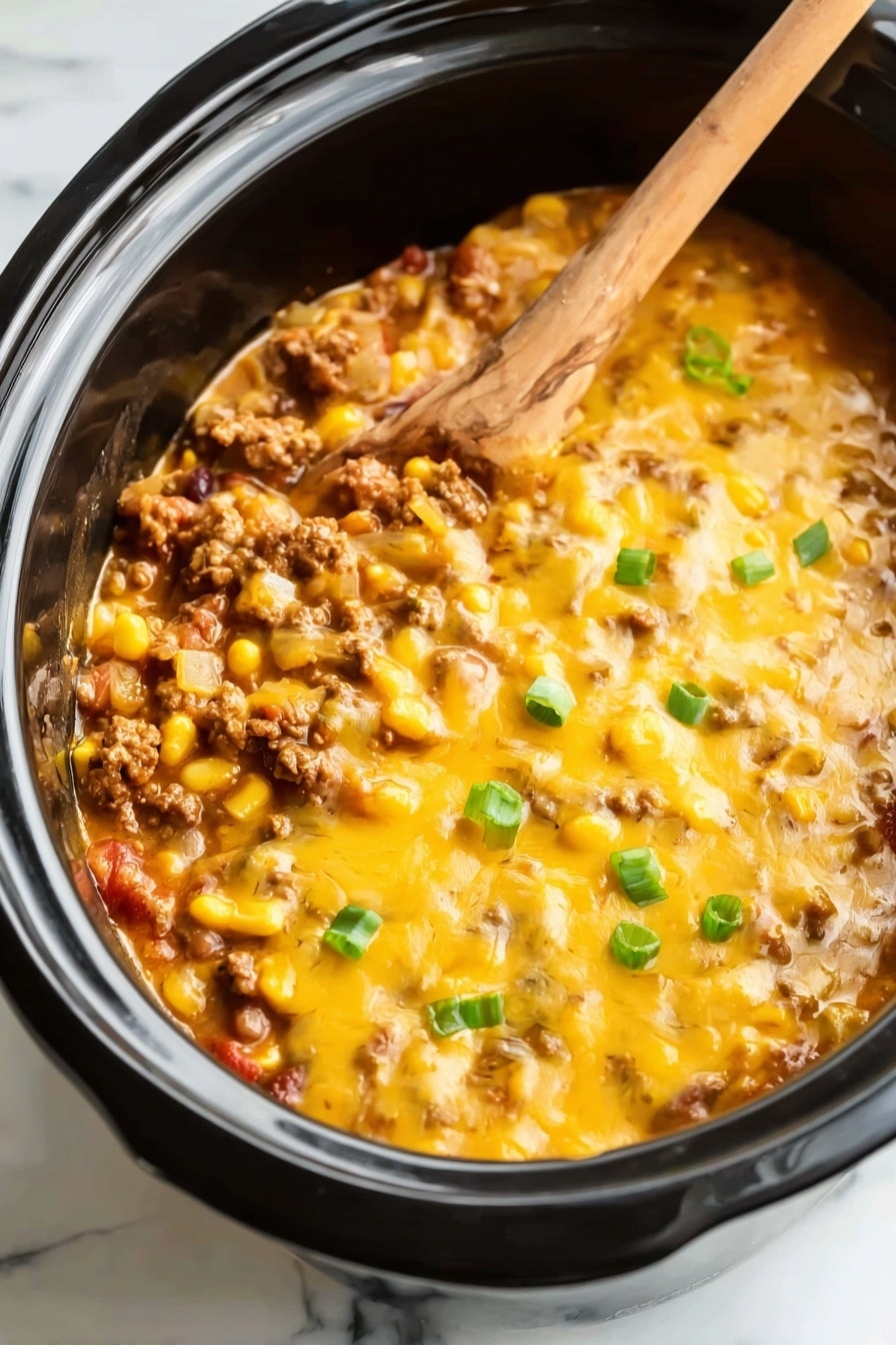 - Serve with toppings: Serve the taco pasta hot, garnished with optional chopped green onions, additional shredded cheese, or sour cream as desired. Enjoy this warm, cheesy slow-cooked meal!