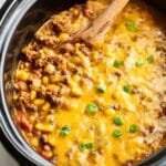 - Serve with toppings: Serve the taco pasta hot, garnished with optional chopped green onions, additional shredded cheese, or sour cream as desired. Enjoy this warm, cheesy slow-cooked meal!
