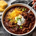 Once cooked, use two forks to shred the meat right in the pot — I love how the chili thickens as the beef breaks apart. Taste and adjust salt as needed. This is also the perfect time to add extra chili powder or a dash of cayenne if you want more heat.