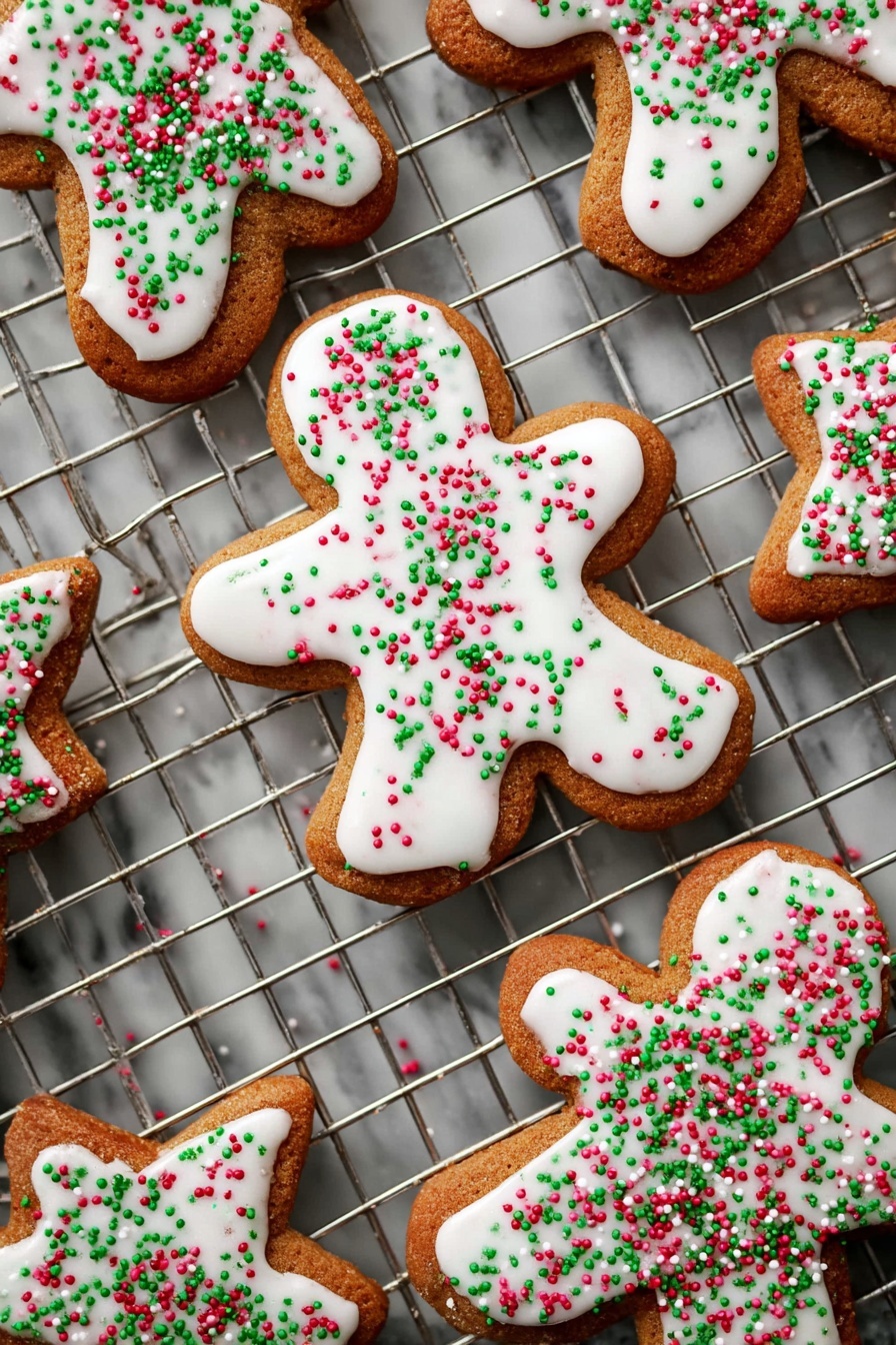 11. Decorate Cookies: Dip each cooled cookie face down into the icing, allowing excess to drip off. Return cookies to the baking sheet or rack and promptly sprinkle with red and green sugar sprinkles. Let icing set before serving.