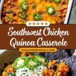 This Southwest Chicken Quinoa Casserole is a hearty and flavorful dish combining tender chicken, protein-packed quinoa, fire-roasted tomatoes, and a medley of colorful vegetables and spices. Baked to perfection with melted cheddar cheese on top, it offers a comforting and nutritious meal with optional toppings like sour cream and avocado to customize your plate.