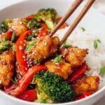 This Chinese Hunan Chicken recipe is a flavorful and spicy stir-fried dish featuring tender chicken strips sautéed with colorful vegetables like broccoli, red bell peppers, and carrots, all coated in a tangy, slightly sweet, and spicy Hunan sauce. Perfectly complemented by garnishes of toasted sesame seeds and spring onions, it’s a quick and satisfying meal served best with steamed rice.