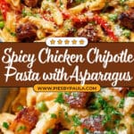 This Spicy Chicken Chipotle Pasta is a vibrant and flavorful dish combining tender chicken, smoky chipotle spices, tender asparagus, and a creamy chipotle sauce loaded with sharp cheddar and Parmesan cheeses. Perfectly cooked penne pasta is tossed with sautéed bell peppers, onions, and a hint of lime for brightness. The dish offers a delicious balance of smoky heat, creamy texture, and fresh vegetable crunch, making it an impressive yet approachable meal for weeknight dinners or entertaining.