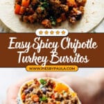 My go-to sides with these spicy chipotle turkey burritos are Mexican street corn salad or a simple lime-cilantro rice. A crunchy cabbage slaw brightens the meal and adds great texture contrast. And if you’re feeling fancy, a side of black beans cooked with epazote or a fresh pico de gallo always hits the spot.