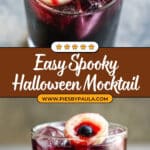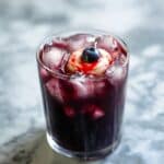 This Spooky Halloween Mocktail is a visually striking and delicious non-alcoholic drink perfect for Halloween parties. Featuring tart cherry juice, cinnamon syrup, and activated charcoal for a dramatic dark hue, it’s garnished with a lychee stuffed with cherry jam and a blueberry to resemble a creepy eye. The sparkling water adds a refreshing fizz to this chillingly tasty beverage.
