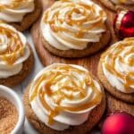 - Assemble Cookies: Pipe frosting onto each cooled cookie, then drizzle with cooled toffee sauce liberally. Serve and enjoy!