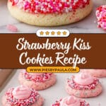 Delicious and fun Strawberry Kiss Cookies made with Funfetti sugar cookie mix, cream cheese, and topped with Hershey’s Strawberry Ice Cream Cone Kisses. These soft, colorful cookies are perfect for parties and celebrations, featuring a sweet and tangy strawberry topping on a sugar cookie base coated with sparkling sanding sugar or crunchy non-pareils.