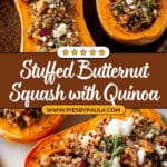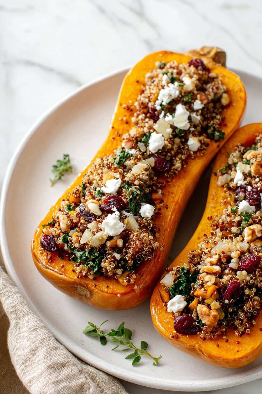 A comforting and nutritious stuffed butternut squash recipe featuring a savory quinoa filling with apples, kale, cranberries, and pecans. Roasted to tender perfection and finished with warm spices, this dish is perfect as a hearty vegetarian main or side that can be customized for vegan diets.