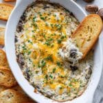 After you take it out of the oven, give the dip about 5 minutes to cool and set up; this helps it thicken slightly and makes serving easier. Then, dig in with baguette slices, crunchy crackers, or fresh veggies — my personal fave!