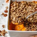 Spoon the mashed sweet potato mixture into your prepared casserole dish and gently press it into an even layer with the back of a rubber spatula. Then sprinkle the pecan oat topping evenly over the surface. Pop it in the oven for about 20 minutes until the topping is toasted, fragrant, and the whole dish is warmed through. When it comes out, you’ll smell the best blend of vanilla, cinnamon, and toasted nuts—just wait until you dig in!