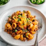 - Add Cheese and Serve: Remove the pan from heat and stir in half of the shredded cheddar cheese until melted. Sprinkle the remaining cheese on top. Serve the pasta hot, garnished with sliced avocado, nonfat plain Greek yogurt, chopped cilantro, jalapeño slices, or any preferred taco toppings.