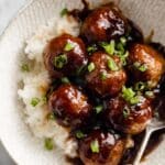 - Serve: Serve the teriyaki chicken meatballs hot over steamed rice. Garnish with sliced green onions and sesame seeds if desired.