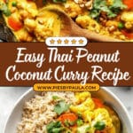This Thai Peanut Coconut Cauliflower Chickpea Curry is a vibrant, hearty, and plant-based dish packed with flavor and texture. Featuring a creamy coconut milk base enriched with spicy red curry paste, peanut butter, and warming turmeric, this recipe blends fresh vegetables like cauliflower, carrots, and bell peppers with protein-rich chickpeas. Garnished with crunchy peanuts and fresh cilantro, this curry is perfect served over brown rice or quinoa for a wholesome, nourishing meal that’s both gluten-free and vegan-friendly.