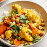 This Thai Peanut Coconut Cauliflower Chickpea Curry is a vibrant, hearty, and plant-based dish packed with flavor and texture. Featuring a creamy coconut milk base enriched with spicy red curry paste, peanut butter, and warming turmeric, this recipe blends fresh vegetables like cauliflower, carrots, and bell peppers with protein-rich chickpeas. Garnished with crunchy peanuts and fresh cilantro, this curry is perfect served over brown rice or quinoa for a wholesome, nourishing meal that’s both gluten-free and vegan-friendly.