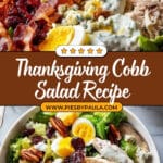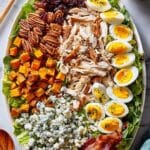 This Thanksgiving Cobb Salad is a festive and hearty salad featuring tender roasted turkey, crispy bacon, steamed eggs, roasted sweet potatoes, crunchy pecans, and tangy blue cheese, all drizzled with a creamy chive dressing. It’s a perfect way to enjoy classic holiday flavors in a fresh and satisfying salad.