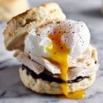 Place the top half of your biscuit or bun on the egg, press gently, and dig in! This sandwich is best enjoyed right away while everything is warm, melty, and inviting. I love how these layers combine different textures and flavors—seriously, breakfast wins with this one.