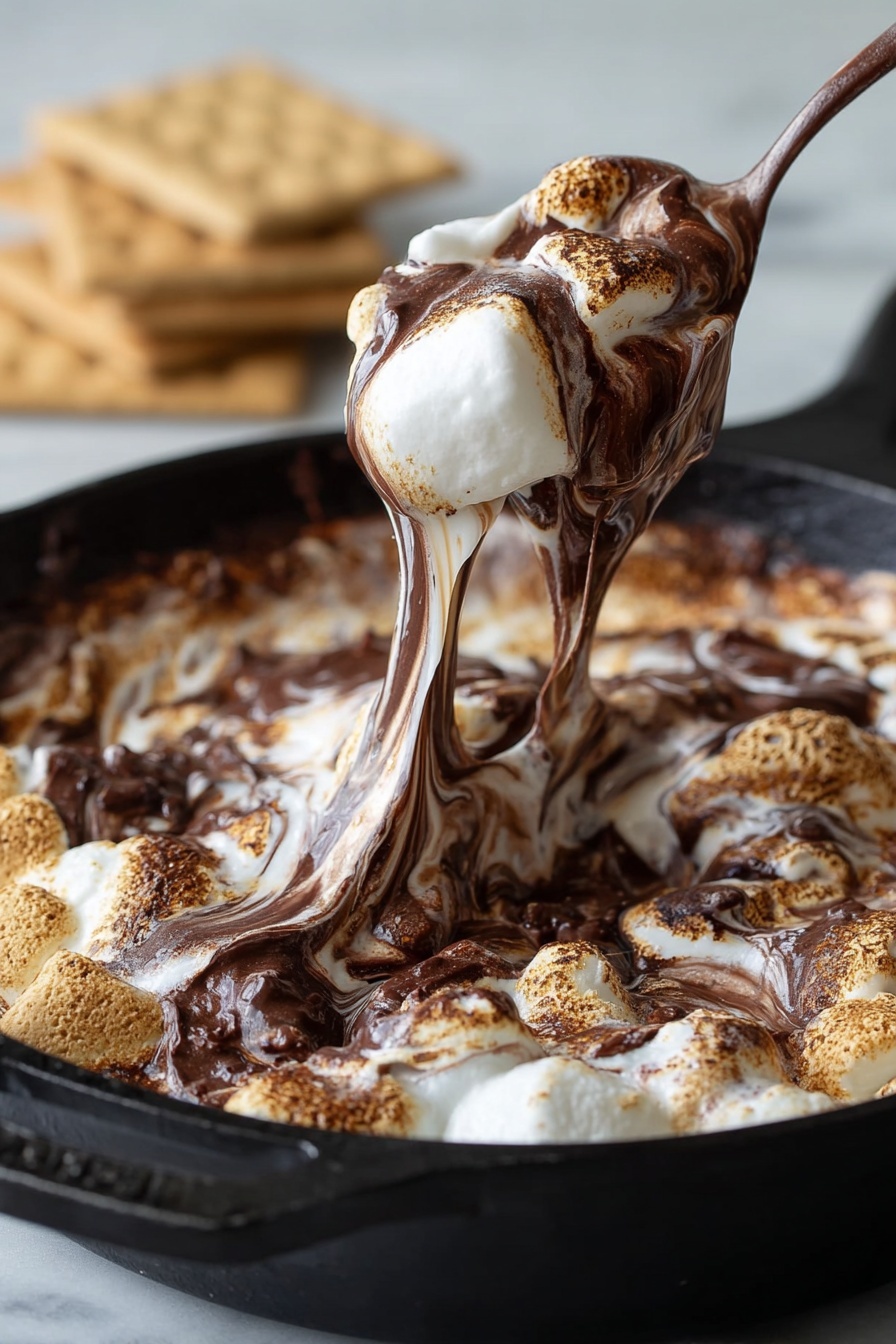 For parties, I like bringing out a rustic wooden board and placing the skillet in the center surrounded by stacks of graham crackers, fruity dippers, and cute little skewers for guests to create their perfect s’mores bites. Another fun idea is layering everything in a clear glass dish so everyone can see the layers of chocolate, cream, and toasted marshmallows—it looks almost too good to eat!