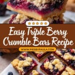 These Triple Berry Crumble Bars combine a buttery shortbread crust with a luscious medley of fresh raspberries, blueberries, and blackberries, topped with a golden, crumbly streusel. Perfectly sweetened and bursting with citrus notes from fresh lemon zest and juice, these bars offer the perfect blend of tart and sweet in every bite. Baked to golden perfection, they make a delicious treat for any occasion, whether for dessert, brunch, or a snack.
