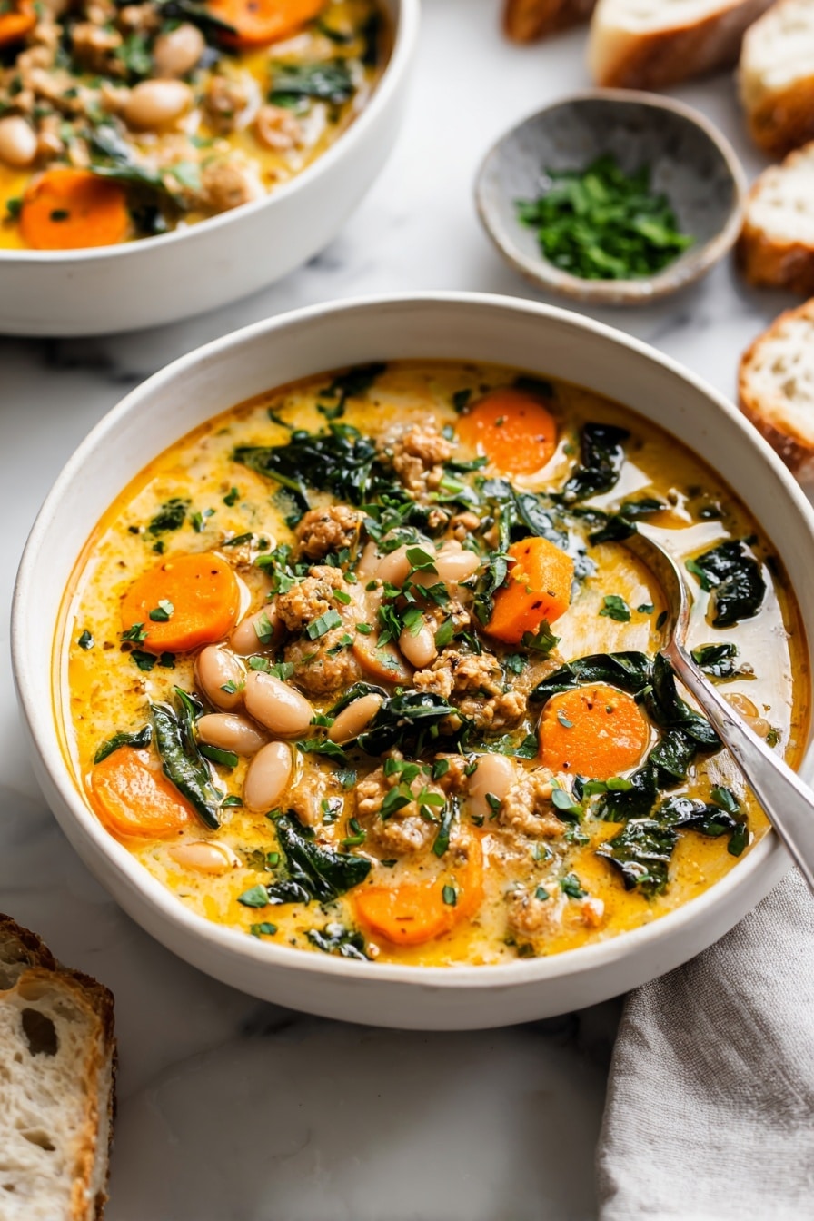 This comforting Tuscan White Bean Soup combines mild Italian sausage, fresh vegetables, Great Northern beans, and a touch of cream to create a rich and hearty dish perfect for cozy meals. Infused with Italian seasoning and a hint of crushed red pepper, this soup offers a delicious balance of savory flavors and creamy texture, finished with fresh spinach and parsley for a nutritious touch.