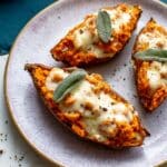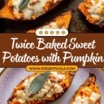 These Twice Baked Sweet Potatoes with Pumpkin and Crispy Sage combine the natural sweetness of tender roasted sweet potatoes with creamy pumpkin puree, savory parmesan cheese, and crispy fried sage for a comforting, flavorful side dish perfect for fall or any hearty meal.