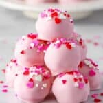 - Decorate: Place coated truffles back on parchment and sprinkle with Valentine’s themed sprinkles while the coating is still soft.