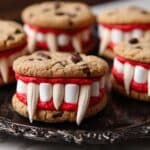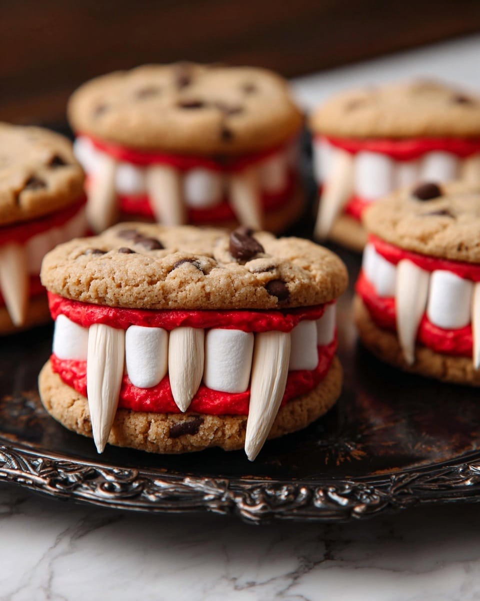 These fun and spooky Vampire Cookies are perfect for Halloween or any party that needs a touch of playful fright. Chocolate chip cookies are baked, sliced in half, and sandwiched with bright red frosting that resembles blood. Mini marshmallows and slivered almonds create chilling vampire fang details, making these treats as visually exciting as they are delicious.