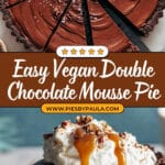 This Vegan Double Chocolate Mousse Pie is a rich, creamy, and indulgent dessert that’s entirely dairy-free and plant-based. Featuring a crunchy pecan and date crust, silky tofu and semi-sweet chocolate filling, this mousse pie is perfect for vegan dessert lovers looking for a decadent treat that’s also easy to prepare with simple ingredients. Optionally topped with caramel sauce or coconut whipped cream, it’s a crowd-pleaser with minimal fuss.