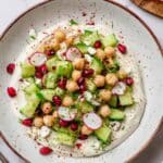 A refreshing and protein-packed vegan salad featuring smashed cucumbers and chickpeas, dressed with a zesty tahini-lime dressing and creamy coconut yogurt. This vibrant dish is perfect for a light lunch or as a side, offering a delightful combination of textures and flavors enhanced by fresh herbs, pomegranate, and vegan feta cheese.