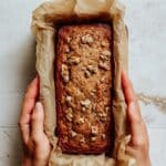 - Transfer to Pan and Bake: Pour the batter into the prepared loaf pan and smooth the top with a spoon. Sprinkle the remaining walnuts on top for a crunchy finish. Bake in the preheated oven for 1 hour to 1 hour 15 minutes. The bread should be firm, golden brown, and crackly on top. Test doneness by inserting a toothpick or knife – it should come out clean or with few crumbs.