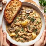 This Cozy White Bean Mushroom Stew is a hearty and comforting vegan dish featuring tender mushrooms, creamy white beans, and baby potatoes simmered in a flavorful blend of herbs and dairy-free milk. Perfect for chilly days, this stew offers a rich, thick texture and a deliciously savory taste, garnished optionally with fresh parsley for a burst of freshness.