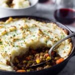- Assemble the Shepherd’s Pie: Spread the cauliflower mash evenly on top of the vegetable and lentil mixture in the oven-safe skillet. Use the back of a spoon to create any decorative patterns if desired.