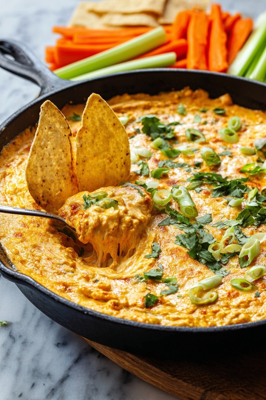 This dip goes perfectly with crunchy dippers like tortilla chips, celery sticks, carrot sticks, or even toasted pita wedges. I’ve also served it alongside a fresh green salad to balance out the spicy richness.
