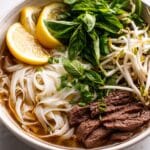This Vietnamese Noodle Soup Recipe features tender slices of beef tenderloin simmered in a fragrant broth infused with aromatic spices like cinnamon, star anise, and cloves. The broth is enriched with fish sauce, hoisin, and soy sauce for depth of flavor. Served over delicate rice stick noodles and topped with fresh lime wedges, sriracha, and crunchy bean sprouts, this comforting dish delivers a perfect balance of savory, sweet, and spicy notes in every bowl.