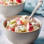 In a small bowl, whisk together ½ cup mayonnaise, 2 tablespoons sugar, ¼ teaspoon salt, and the remaining teaspoon of lemon juice until smooth. This blend balances creamy with just enough sweetness and a hint of tang. Then whip 1 cup of heavy cream until stiff peaks form and gently fold it into your mayo mixture. Whipping the cream separately is key—it lightens up the dressing and makes the salad feel luxuriously smooth rather than heavy.