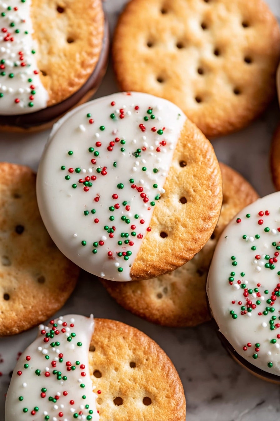 These White Chocolate Nutella Ritz Crackers Cookies are a delightful no-bake treat featuring crispy Ritz crackers sandwiched with creamy Nutella and dipped in smooth melting white chocolate flavored with peppermint. Finished with festive holiday sprinkles or crushed candy canes, they make for a perfect holiday dessert or snack that’s quick and easy to prepare.