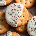 These White Chocolate Nutella Ritz Crackers Cookies are a delightful no-bake treat featuring crispy Ritz crackers sandwiched with creamy Nutella and dipped in smooth melting white chocolate flavored with peppermint. Finished with festive holiday sprinkles or crushed candy canes, they make for a perfect holiday dessert or snack that’s quick and easy to prepare.