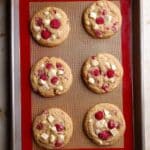 - Form Cookie Dough Balls: Using a small cookie scooper (about 2 tablespoons), scoop out evenly sized dough balls and place them about 2 inches apart on the prepared baking sheet. Optionally, top each dough ball with a few extra raspberry pieces.