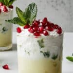 I always top my White Christmas Mojito with a fresh mint sprig and a handful of pomegranate seeds. The mint adds a lovely aroma as you bring the glass to your lips, and the pomegranate seeds give a festive splash of red—plus a fun little burst of juicy sweetness when you bite into them.