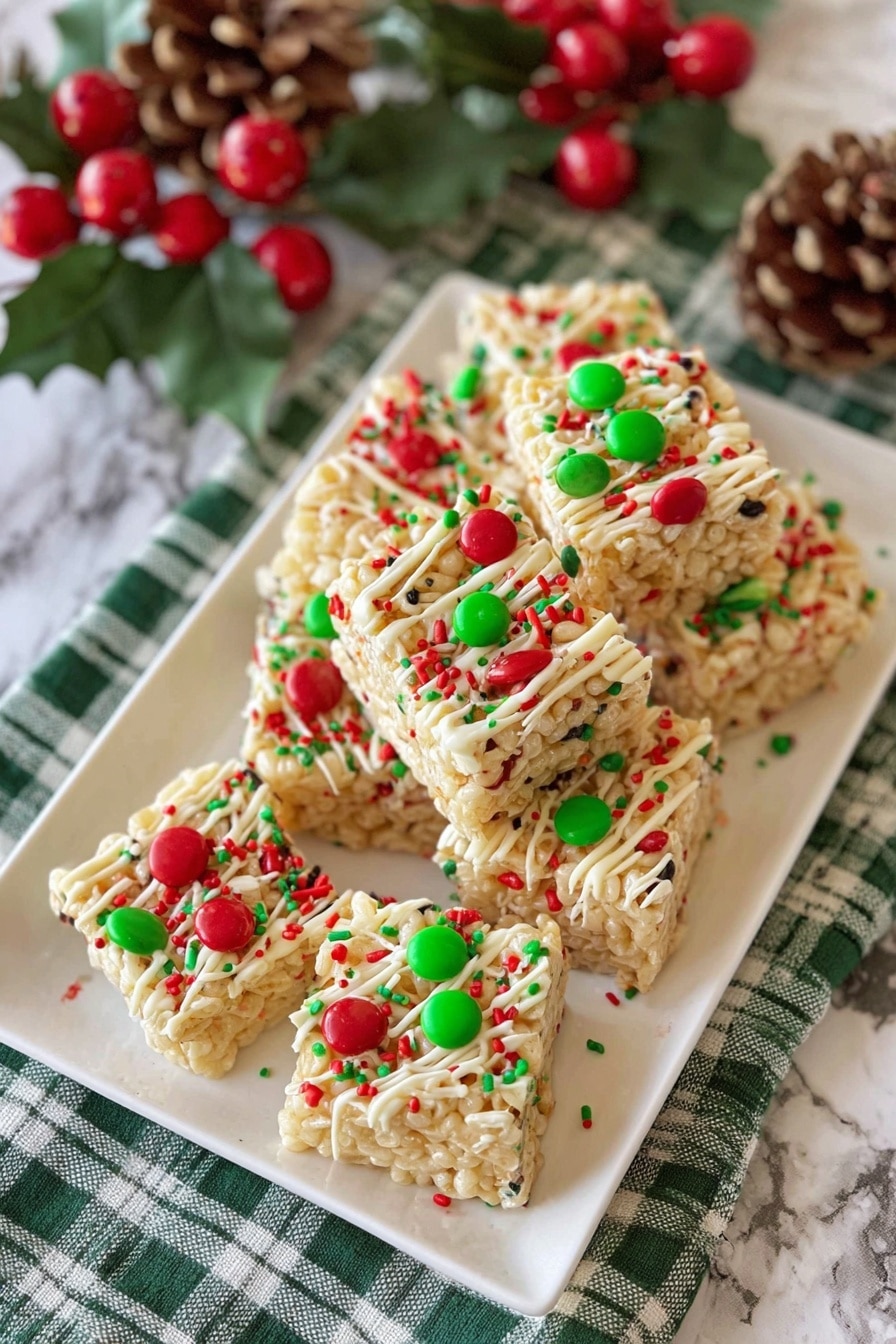 - Add Toppings: Drizzle the melted white chocolate evenly over the top, then scatter Christmas sprinkles and M&Ms for a colorful festive look.