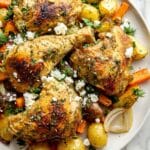 This Easy Whole Roasted Chicken Recipe offers a flavorful, juicy spatchcocked chicken roasted alongside tender fingerling potatoes, carrots, and onions. A simple blend of olive oil, lemon, garlic, and spices creates a vibrant marinade that penetrates the meat for a perfectly crispy skin and succulent texture. This classic roast, garnished with fresh herbs and crumbled feta, is perfect for a comforting weeknight dinner or special occasion.